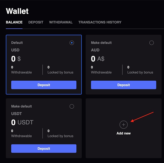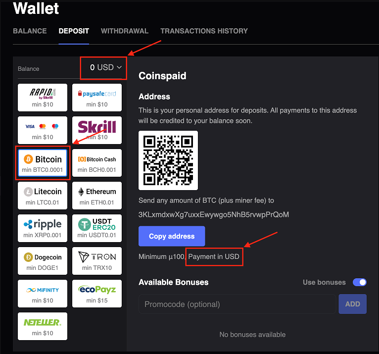 Deposit in BTC ⇒ Get money on USD balance ⇒ Play with USD