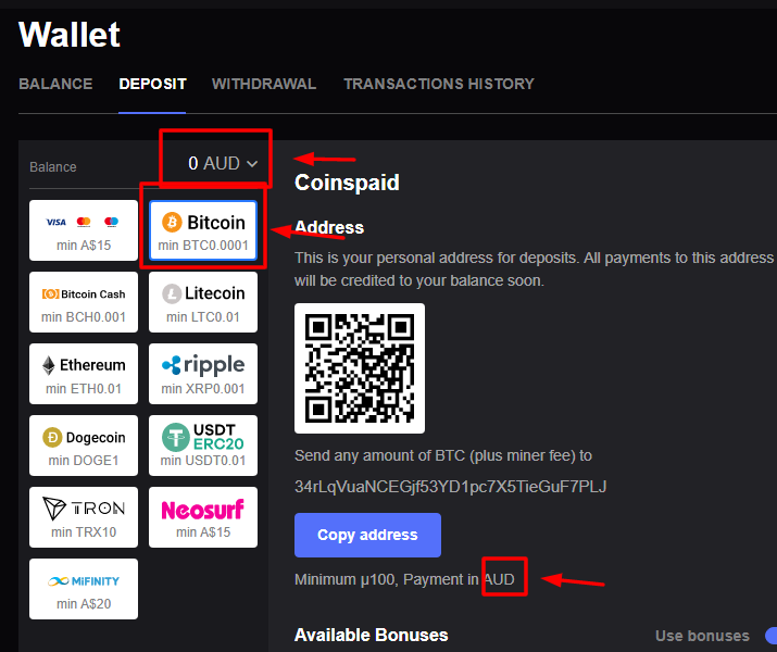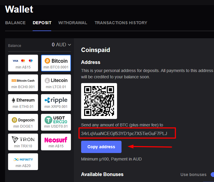 Login to your Mirax account. Click the “Deposit” button in the upper tab. Use the BTC/AUD currency pair for exchange. Specify a sum. Copy the wallet address and paste it into CoinsPaid. The deposit will appear on your AUD fiat balance.