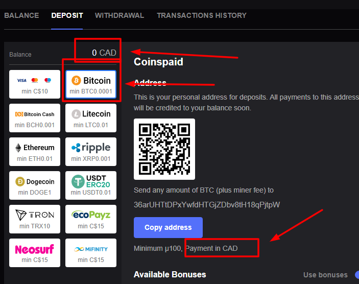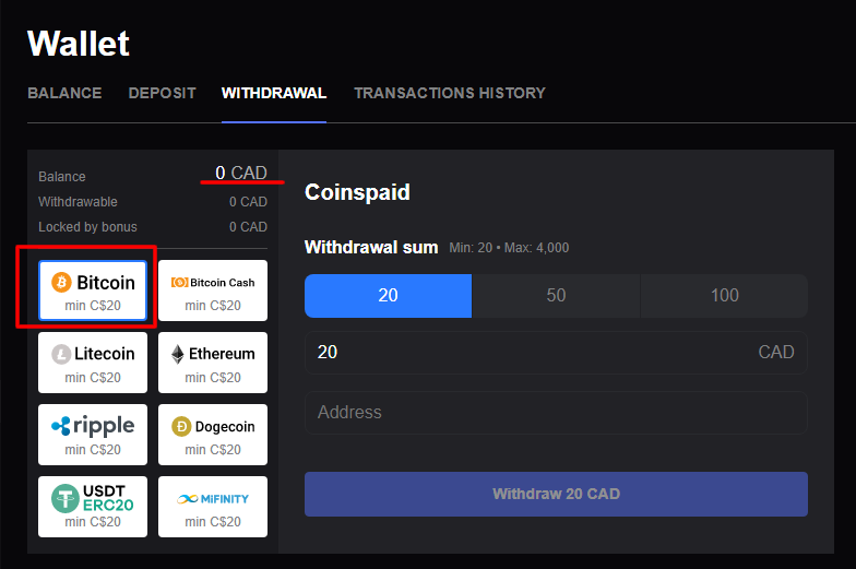 Deposit in BTC ⇒ Get money on CAD balance ⇒ Play with CAD