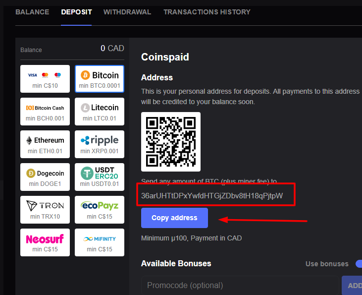 Copy the wallet address and insert it into the relevant field in the “Send” section of your CoinsPaid account. If you have promo codes, use them to receive fantastic bonuses from Mirax.